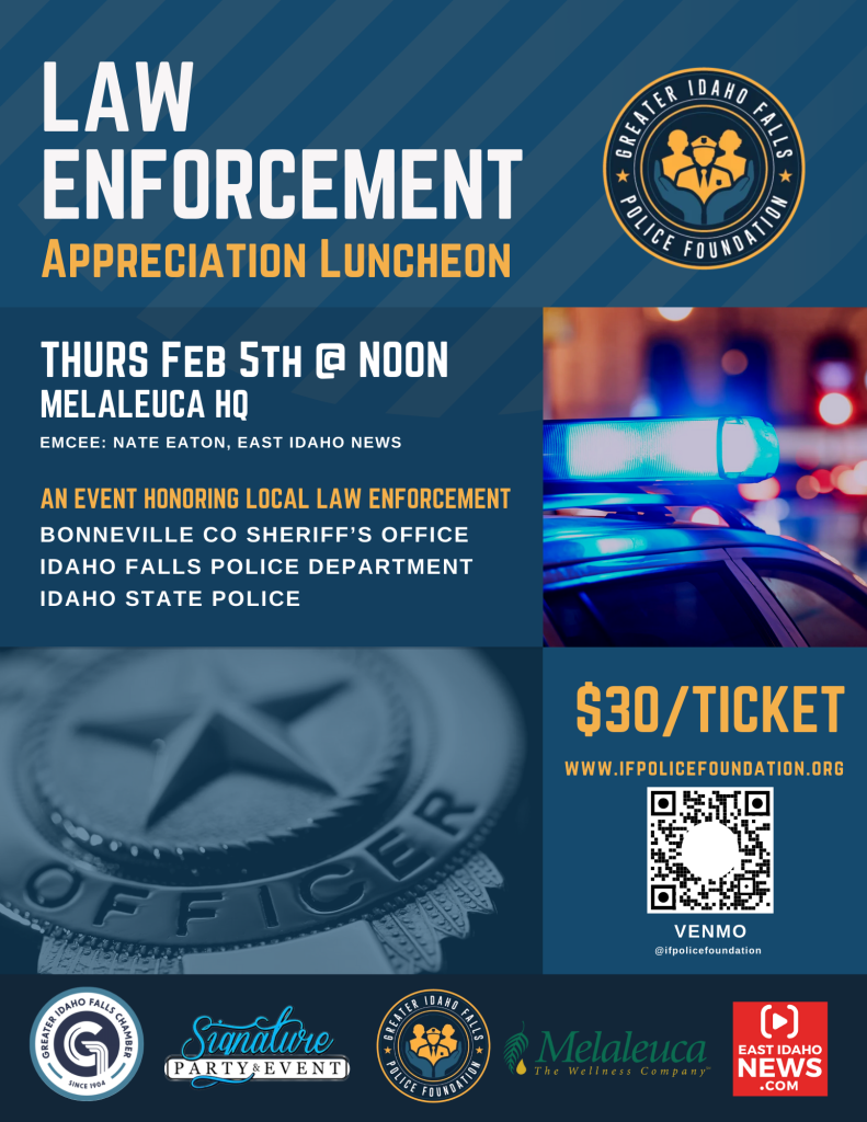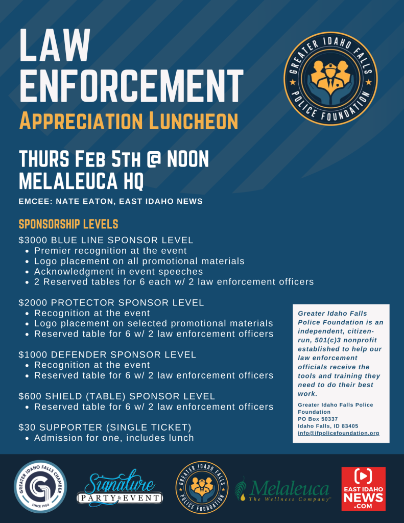 Tickets to the Law Enforcement Appreciation Luncheon are $30 per person and are available to the public. Proceeds support ongoing community and law enforcement initiatives led by the Greater Idaho Falls Police Foundation.