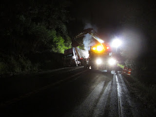 On May 22nd, 2018, at approximately 1820 hours, a commercial motor vehicle crash occurred on west US 12 near milepost 76.6 in Idaho County, Idaho. The crash occurred in the construction zone just east of Kooskia, Idaho. A 2017 Mack truck tractor driven by Kenneth E. Kazda, 43, of Lewiston, was hauling a 53 foot Western trailer traveling west through the construction zone. As Kazda negotiated the curve established by the traffic cones, the trailer's tires drove onto the soft road edge, entered the ditch, and the trailer tipped onto its right side. The trailer came to rest against the hillside leaving the Mack truck tractor partially blocking the westbound lane. The trailer was fully loaded with wood chips. Kazda was wearing his seatbelt. US 12 was blocked for approximately 2 hours. The investigation is continuing.